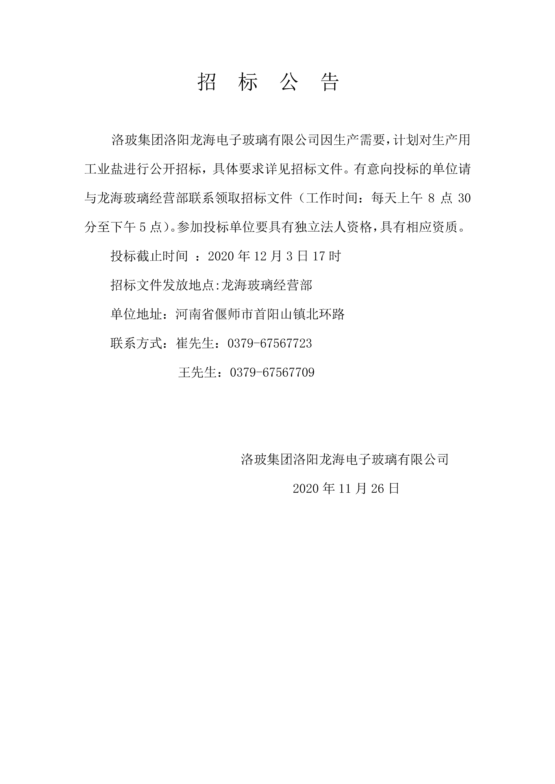 Luobo Group Luoyang Longhai Electronic Glass Co., Ltd. Production Industrial Salt Bidding Announcement