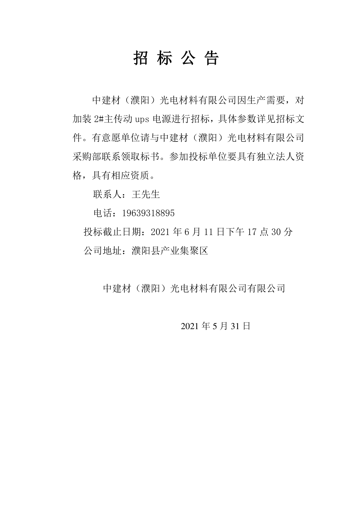 Tender Announcement for Installation of 2 # Main Drive UPS Power Supply by China National Building Materials (Puyang) Optoelectronic Materials Co., Ltd