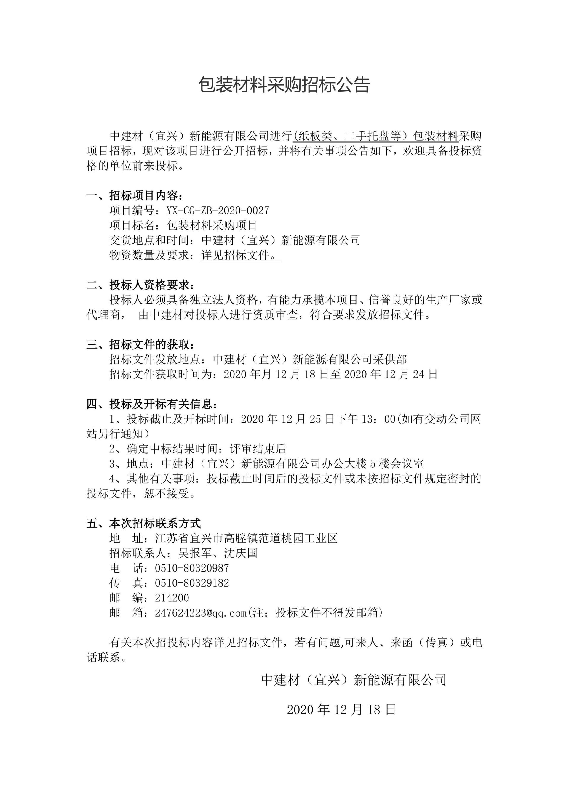 Announcement of Bidding for the Procurement Project of Packaging Materials (Cardboard, Second hand Tray, etc.) by China National Building Materials (Yixing) New Energy Co., Ltd