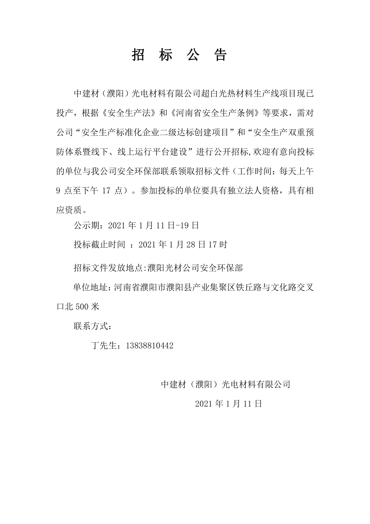 Tender Announcement for Safety Standardization and Dual Prevention Mechanism of Super White Light Thermal Material Production Line Project of China National Building Materials (Puyang) Optoelectronic Materials Co., Ltd
