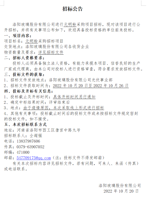 Tender for the procurement project of sodium pyroantimonate and antimony trioxide for Luoyang Glass Co., Ltd