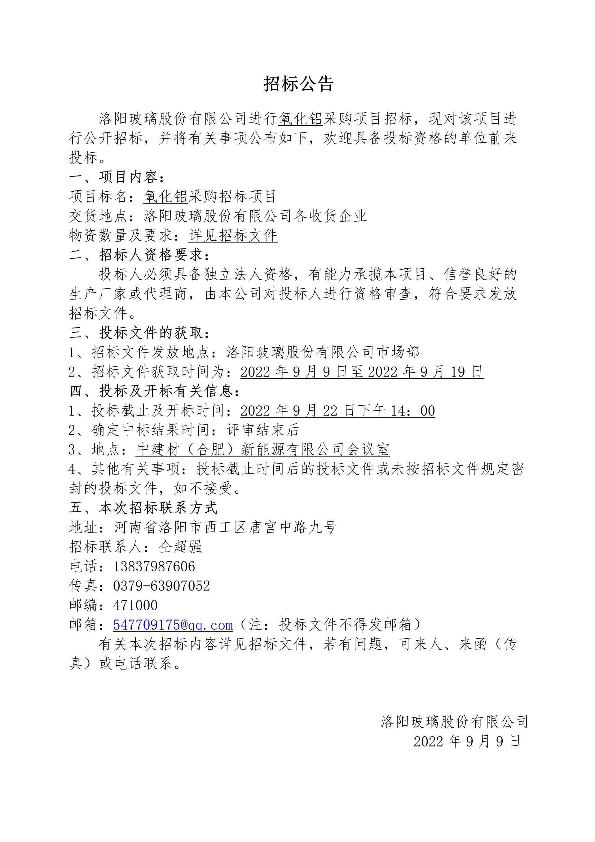 Tender Announcement for Aluminum Oxide Procurement Project of Luoyang Glass Co., Ltd