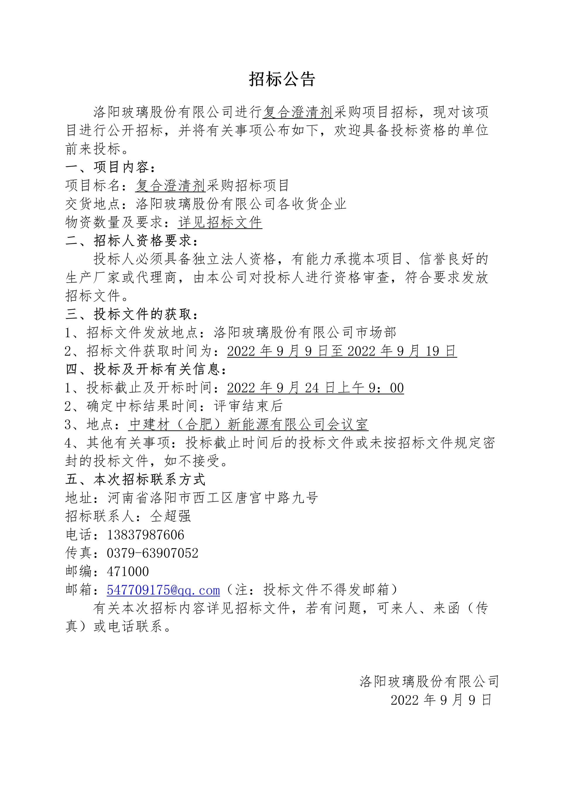 Tender Announcement for the Procurement Project of Sodium Pyroantimonate and Antimony Trioxide by Luoyang Glass Co., Ltd