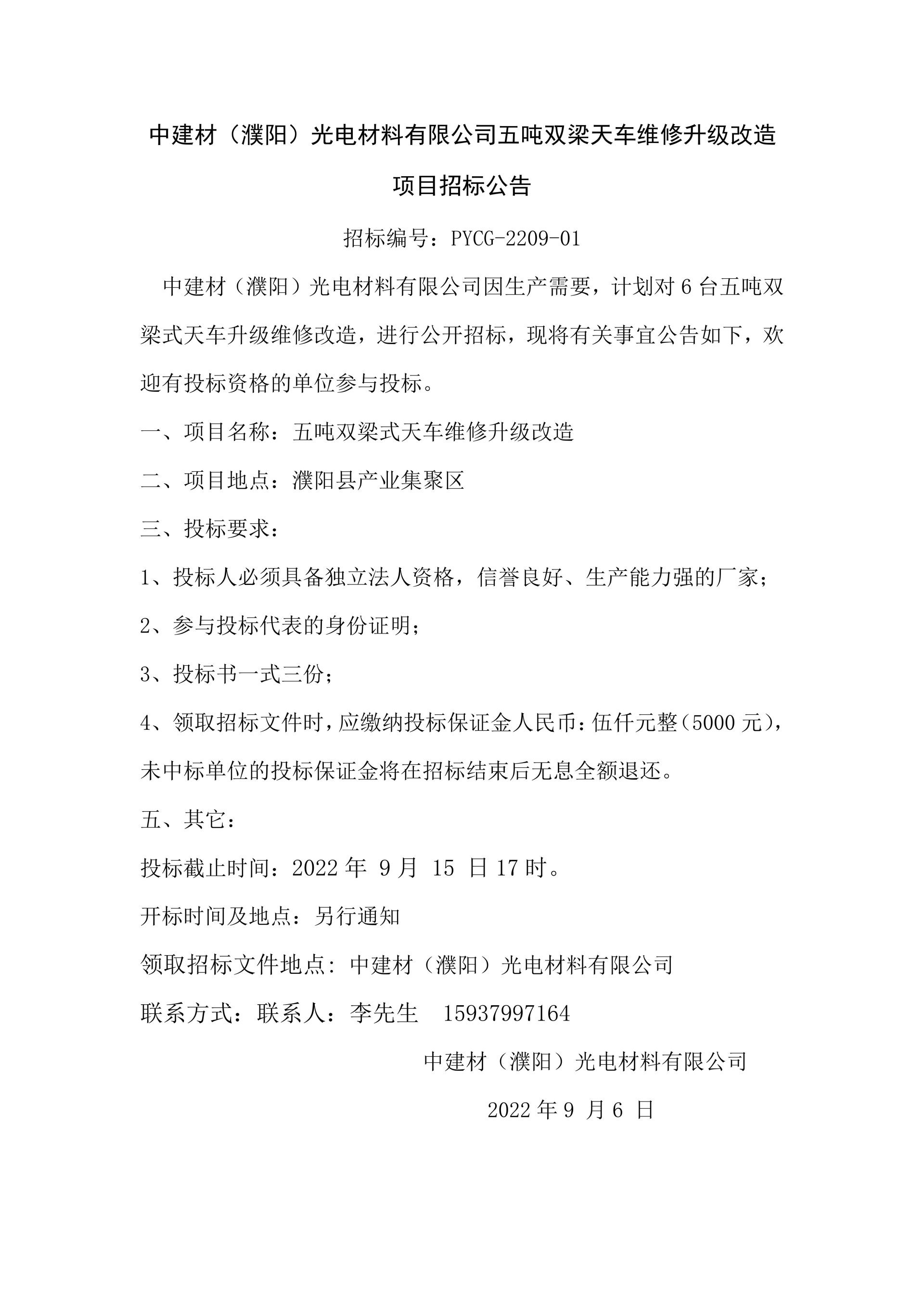 Tender Announcement for the Maintenance, Upgrade and Renovation Project of Five ton Double Beam Crane by China National Building Materials (Puyang) Optoelectronic Materials Co., Ltd