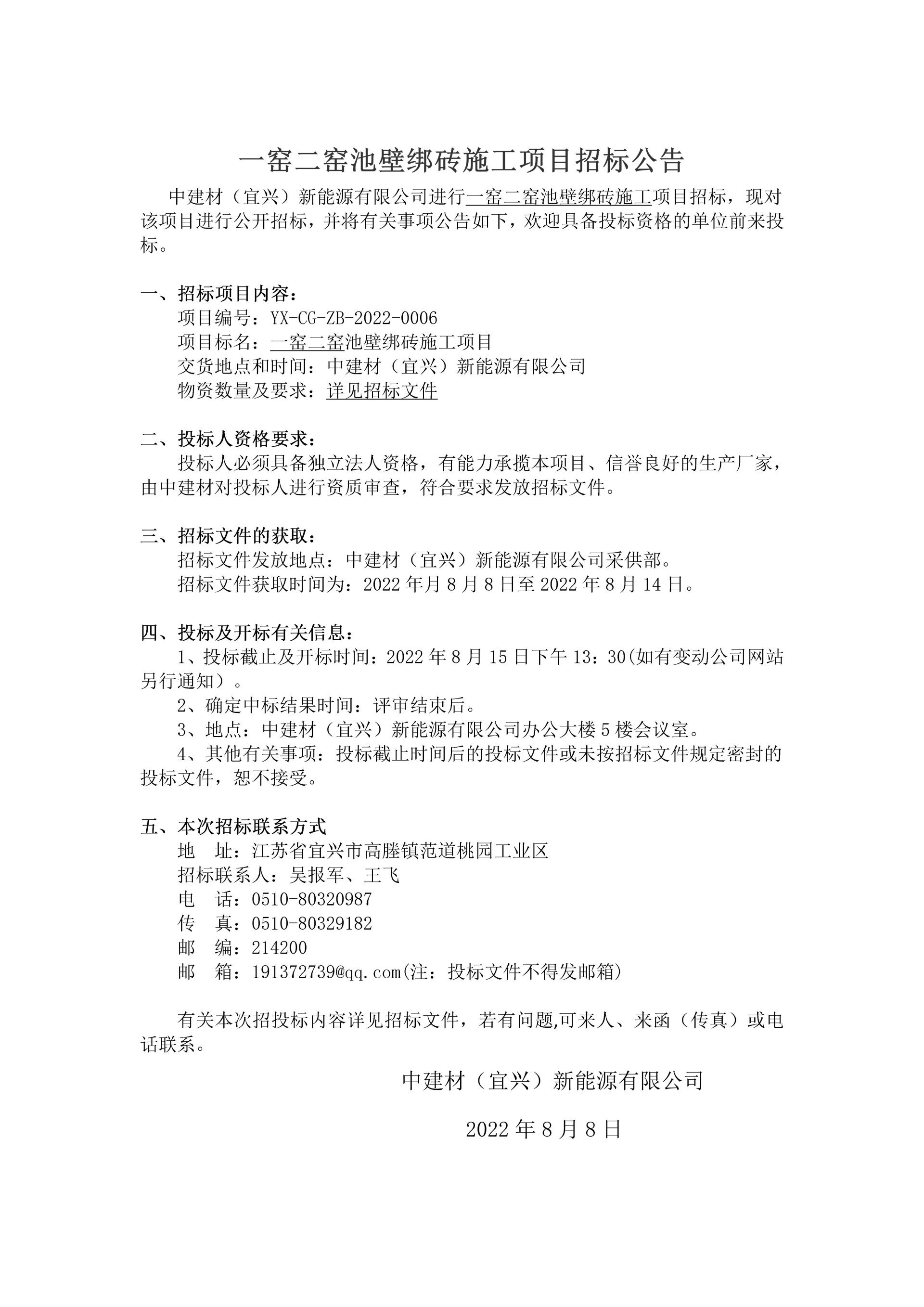 Tender Announcement for the Construction Project of Binding Bricks on the Walls of the First and Second Kilns of China National Building Materials (Yixing) New Energy Co., Ltd