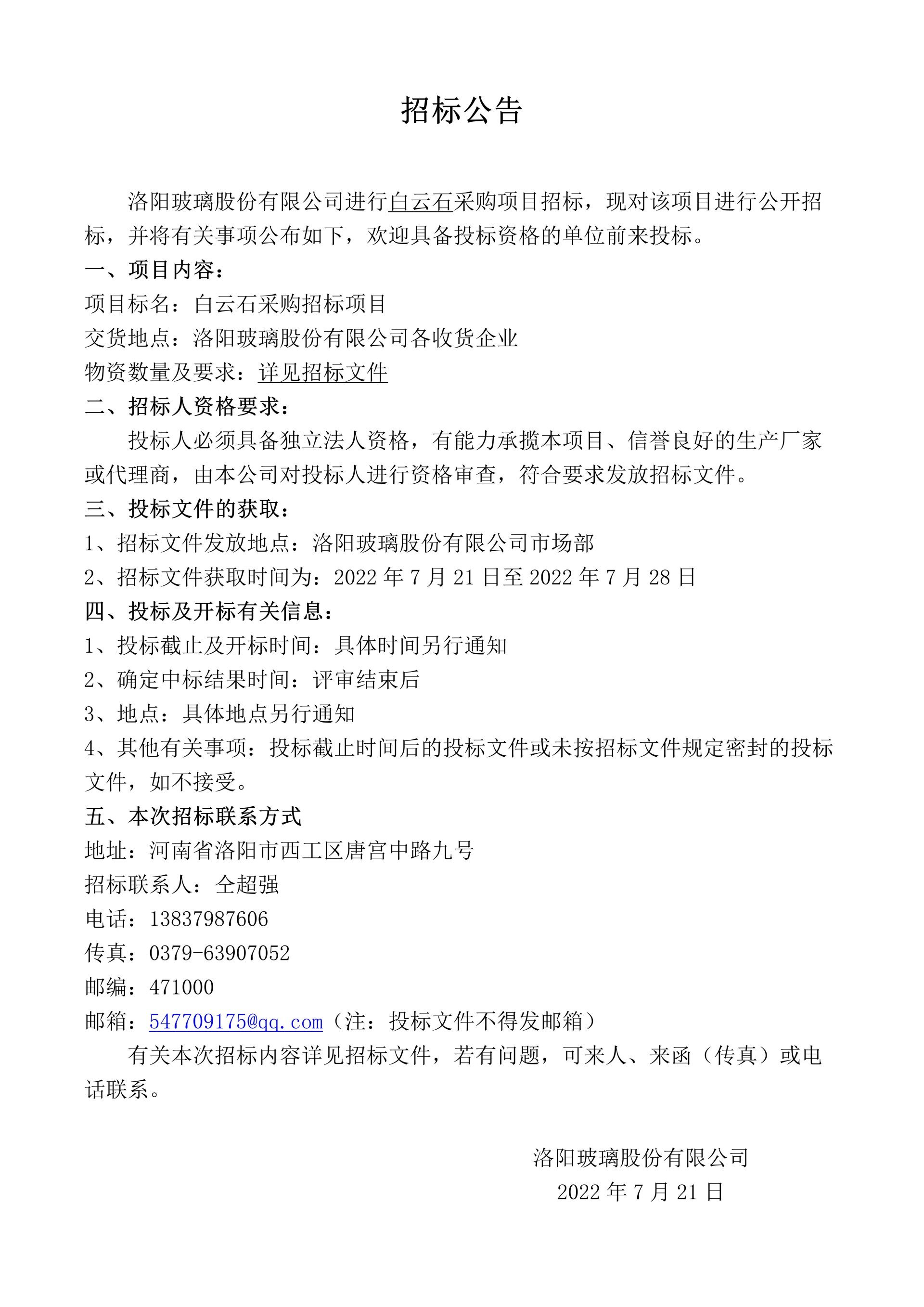 Tender Announcement for Limestone Procurement Project of Luoyang Glass Co., Ltd