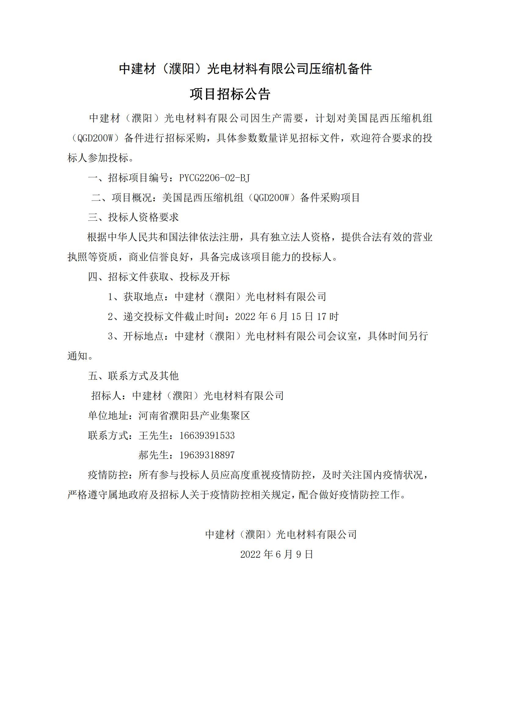 Tender Announcement for Quincy Compressor Spare Parts Project of China National Building Materials (Puyang) Optoelectronic Materials Co., Ltd