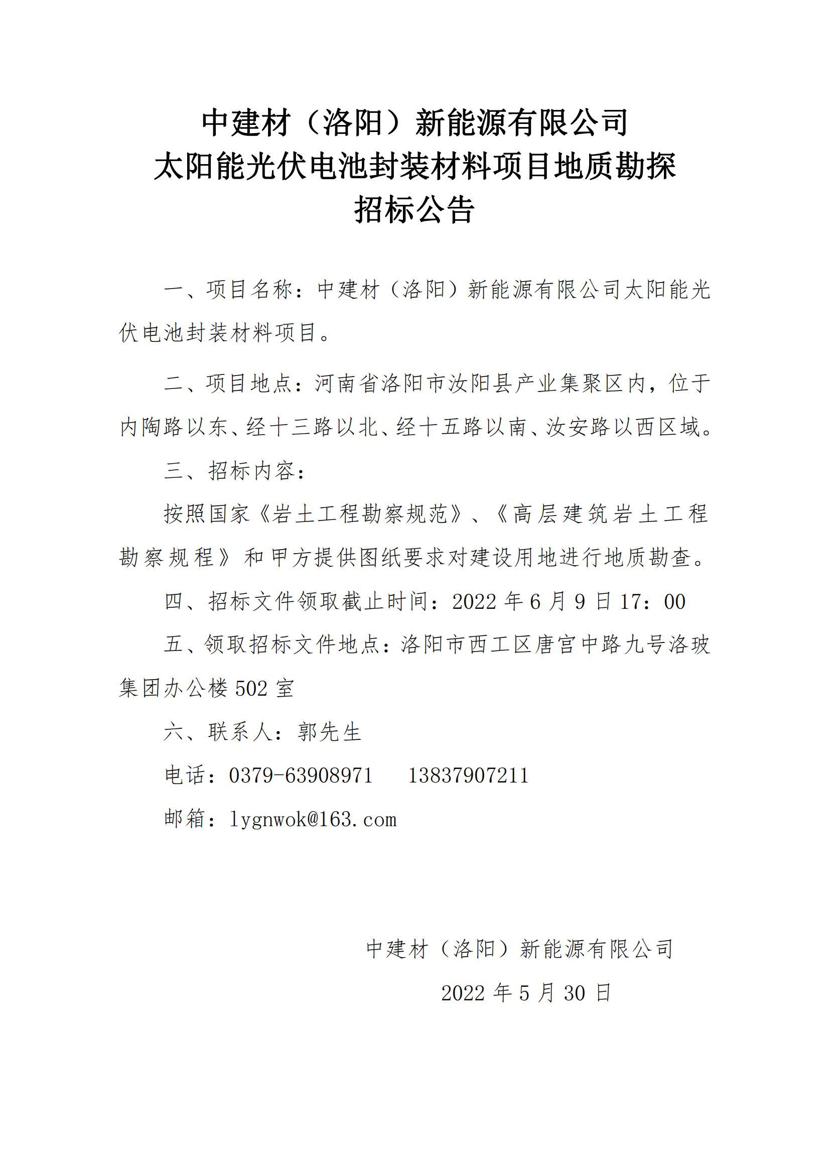 Geological Exploration Bidding Announcement for Solar Photovoltaic Cell Packaging Material Project of China National Building Materials (Luoyang) New Energy Co., Ltd