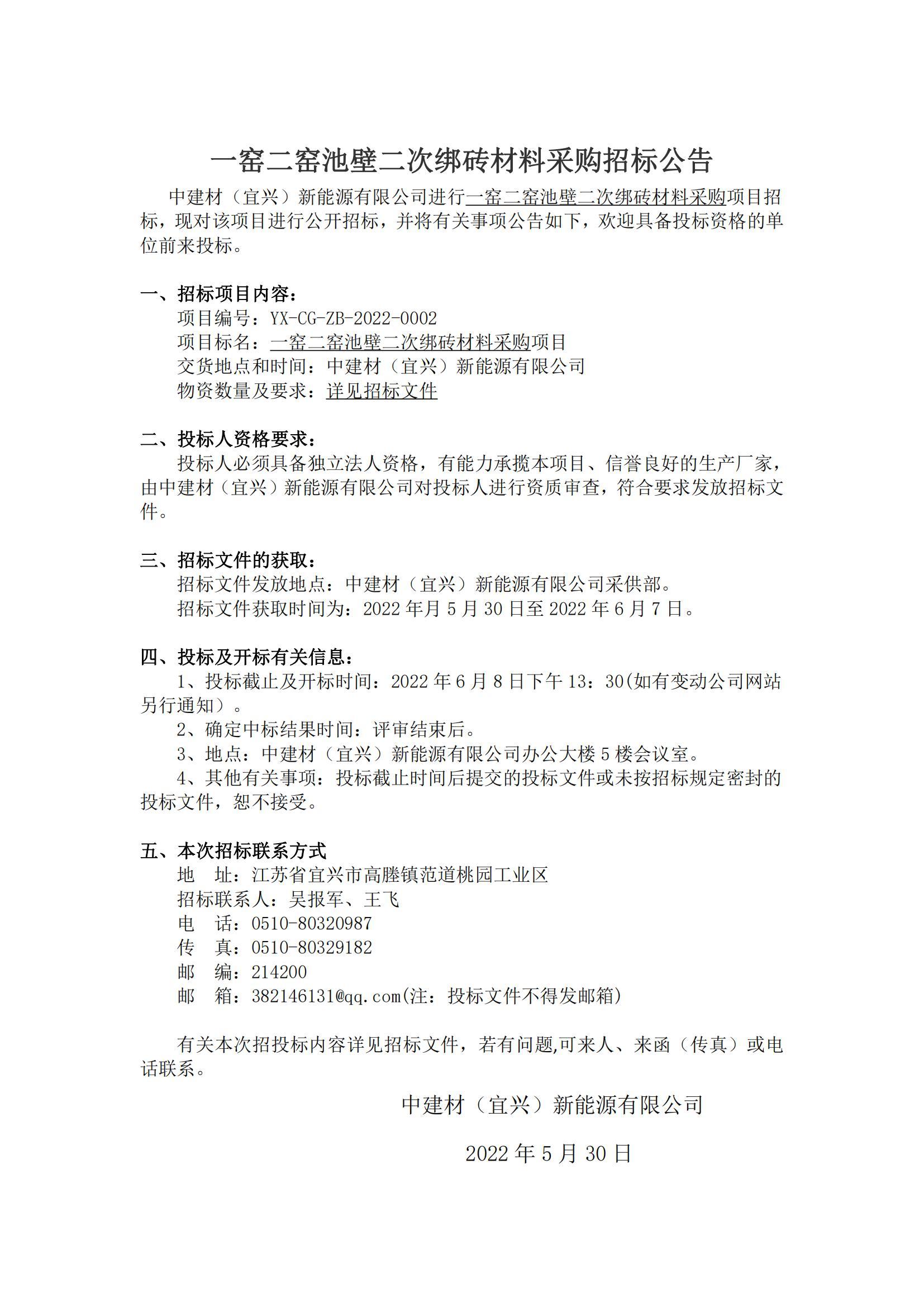 Announcement of Tender for Procurement of Secondary Binding Brick Materials for Tank Walls of Kiln 1 and Kiln 2 of China National Building Materials (Yixing) New Energy Co., Ltd