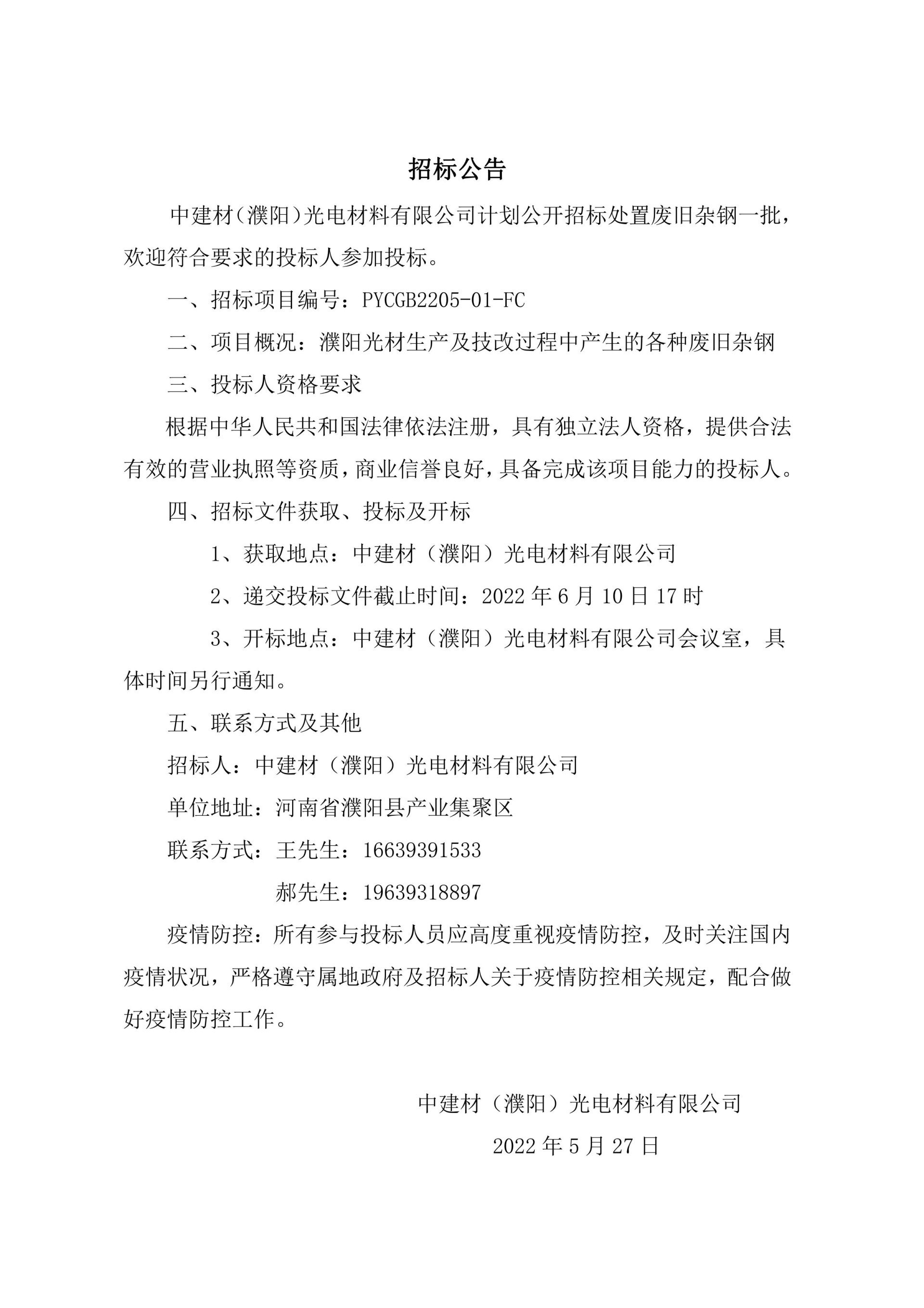 Tender Announcement for Disposal of Waste and Miscellaneous Steel by China National Building Materials (Puyang) Optoelectronic Materials Co., Ltd