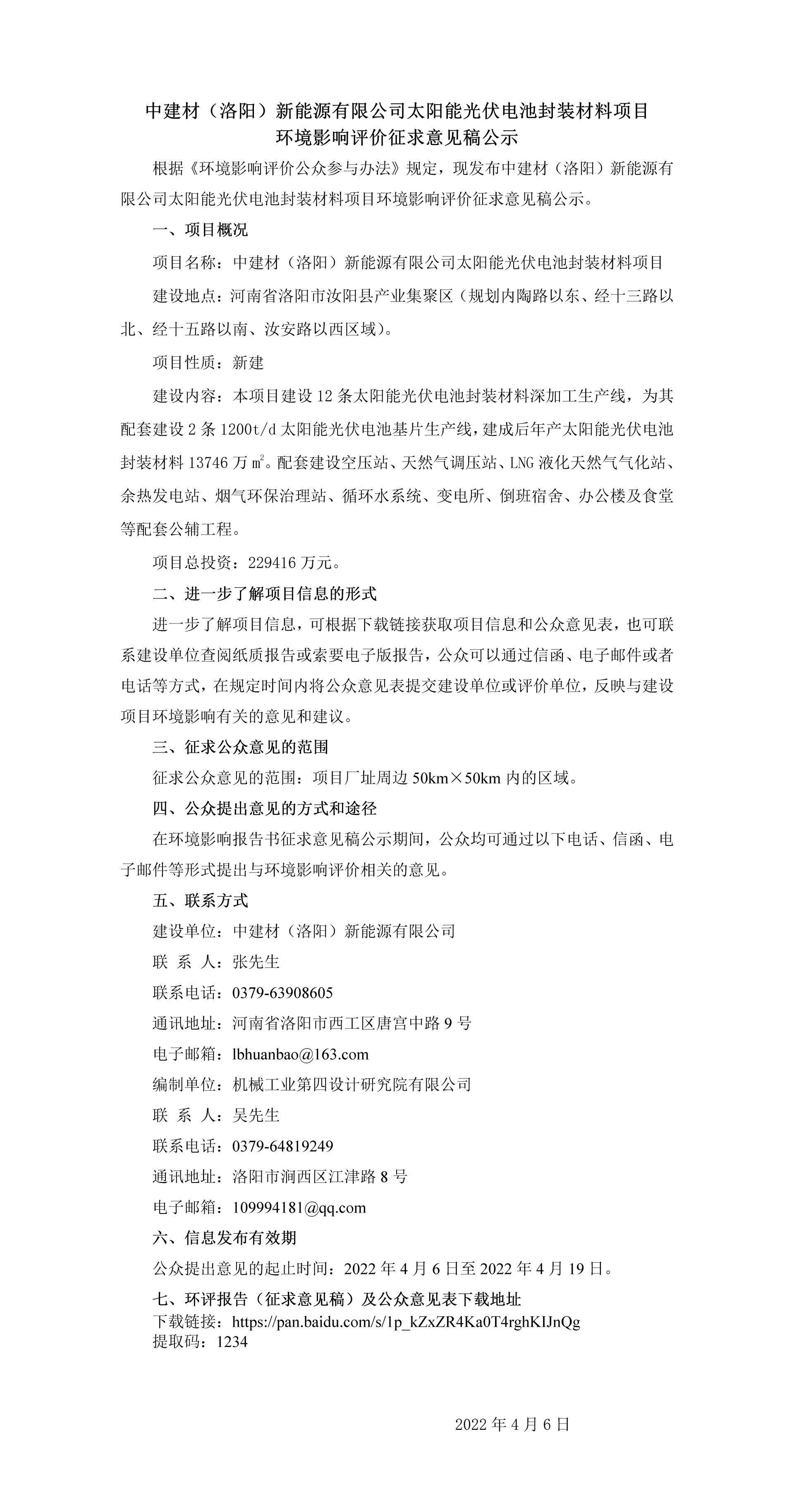 The draft for soliciting opinions on the environmental impact assessment of the solar photovoltaic cell packaging material project of China National Building Materials (Luoyang) New Energy Co., Ltd. is publicly released