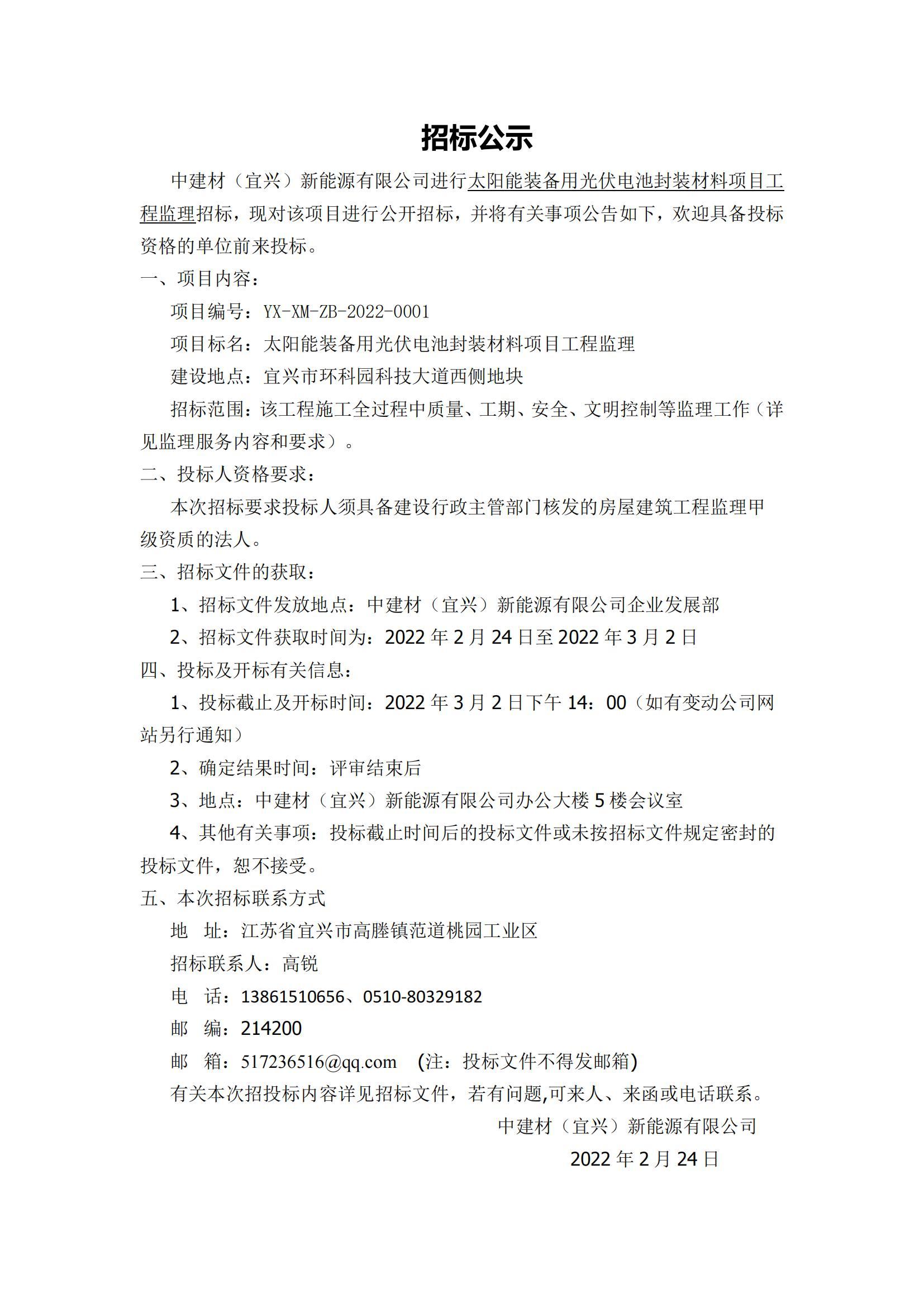 Announcement of Bidding for Engineering Supervision of Photovoltaic Cell Packaging Material Project for Solar Energy Equipment of CNBM (Yixing) New Energy Co., Ltd