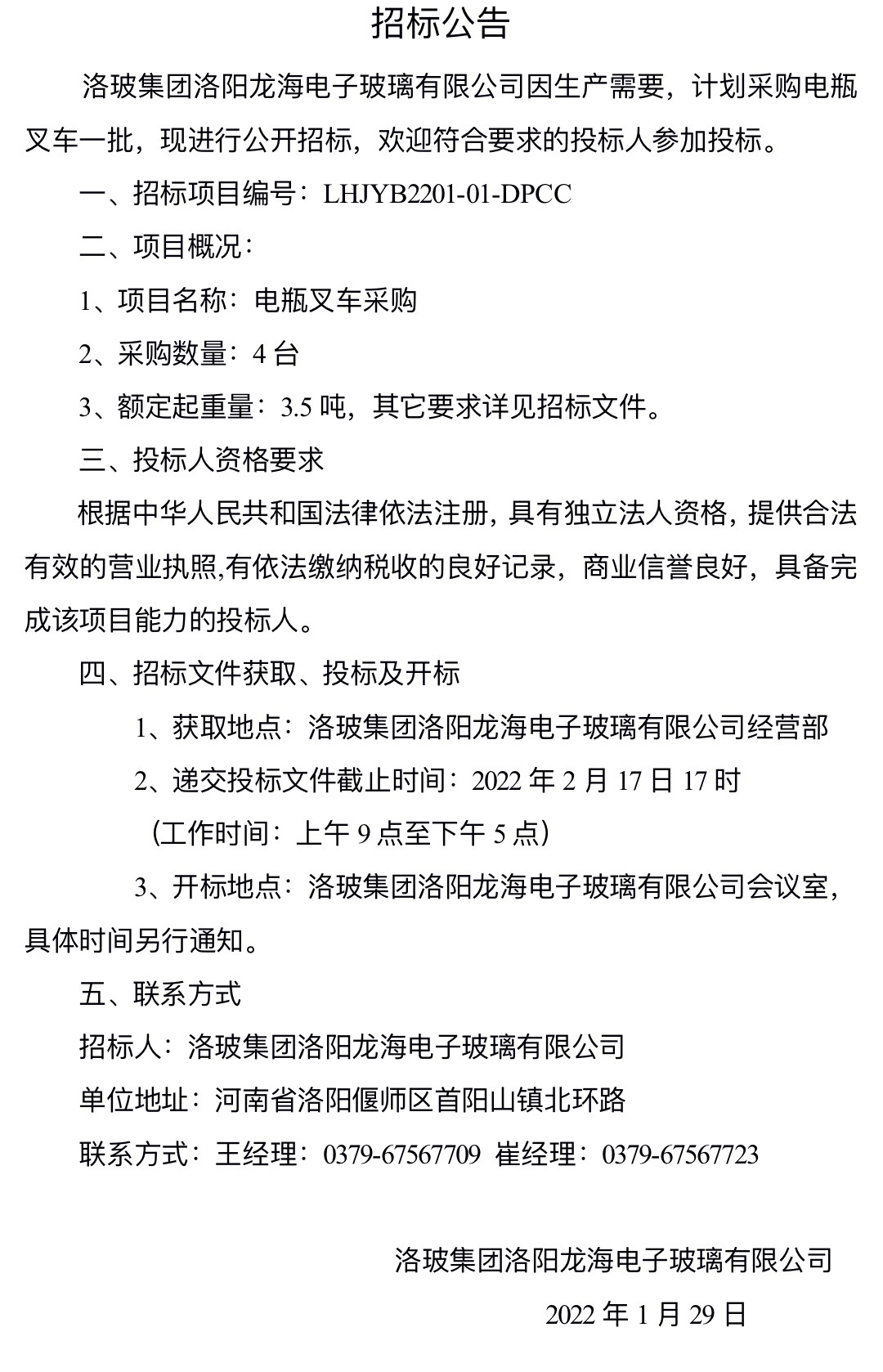 Announcement of Bidding for the Procurement of Battery-Powered Forklifts by Luoyang Longhai Electronic Glass Co., Ltd., LuoBo Group