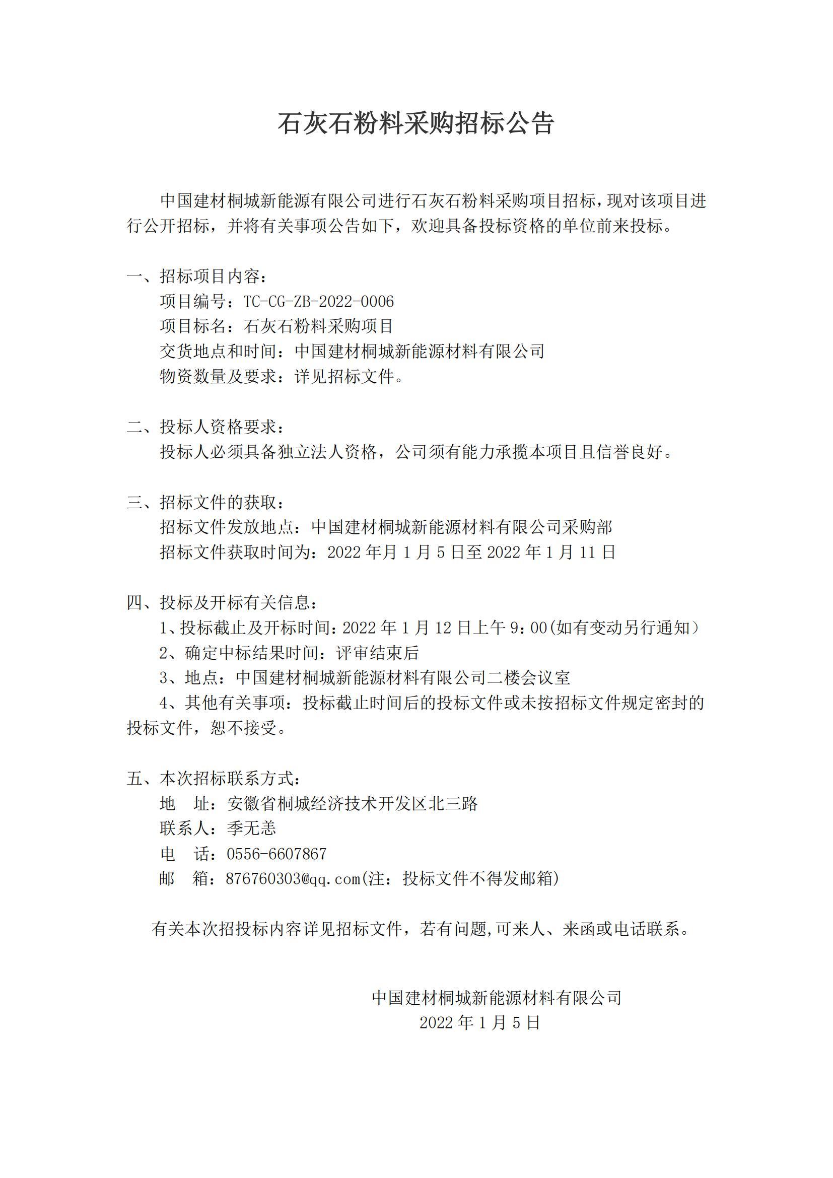 Announcement of Bidding for Limestone Powder Procurement Project by China Building Materials Tongcheng New Energy Co., Ltd